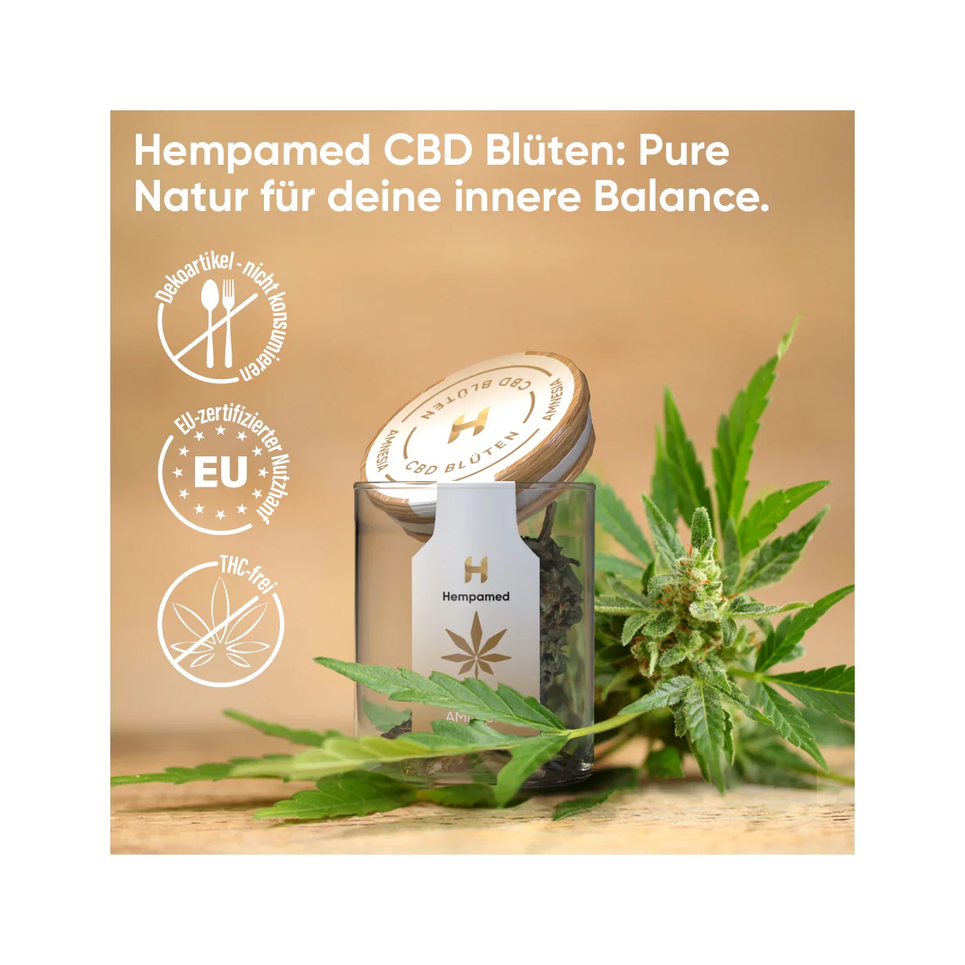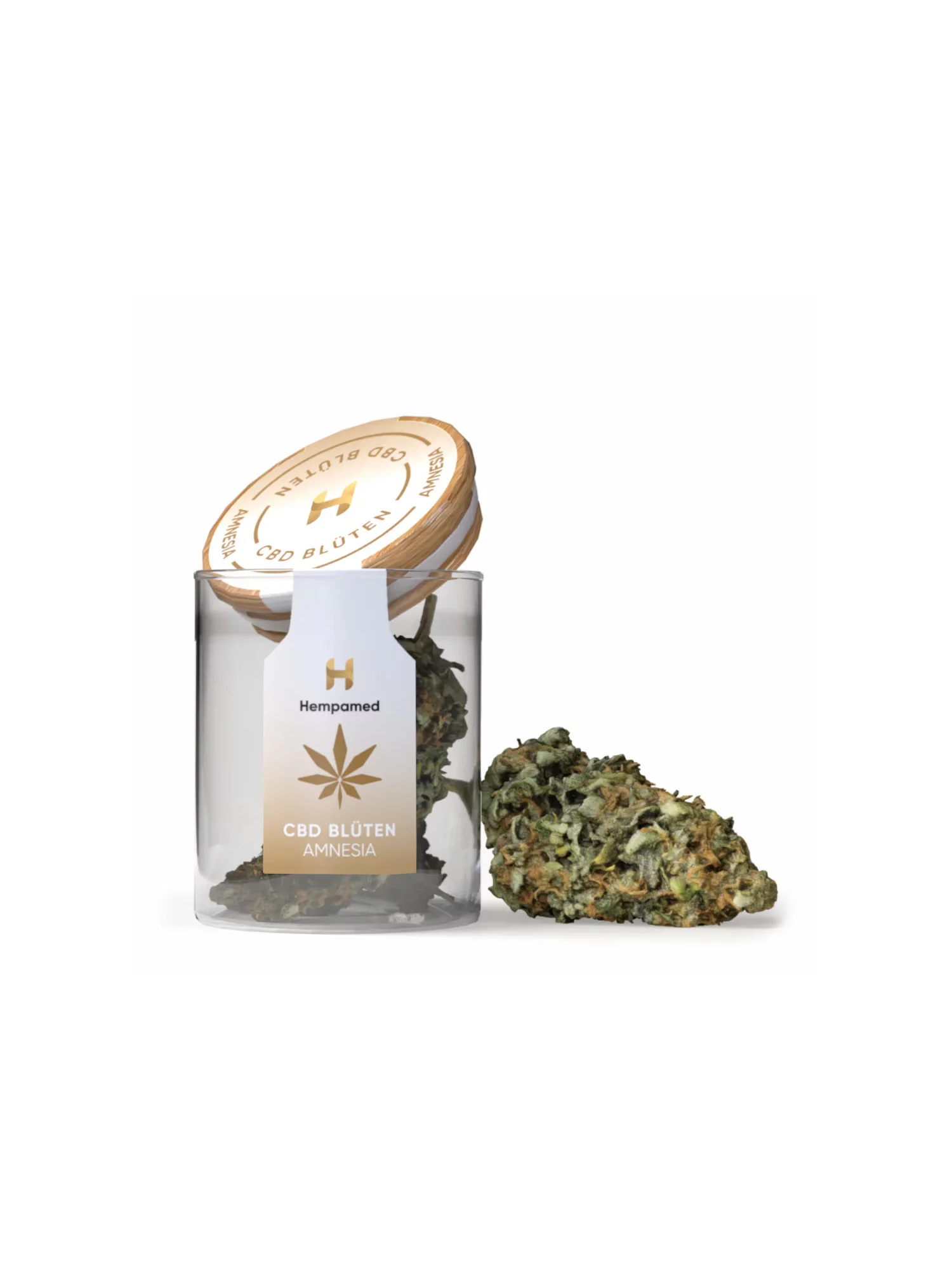 Die CBD-Blüte Amnesia von Hempamed enthält nicht nur nachweislich kein THC, sondern überzeugt auch durch ihre edle Optik und ihren natürlichen Charakter. Eine dichte orange-goldene Trichomenstruktur verleiht der Blüte ihren typischen Haze-Look – ein echtes Highlight für Dekorationsliebhaber.